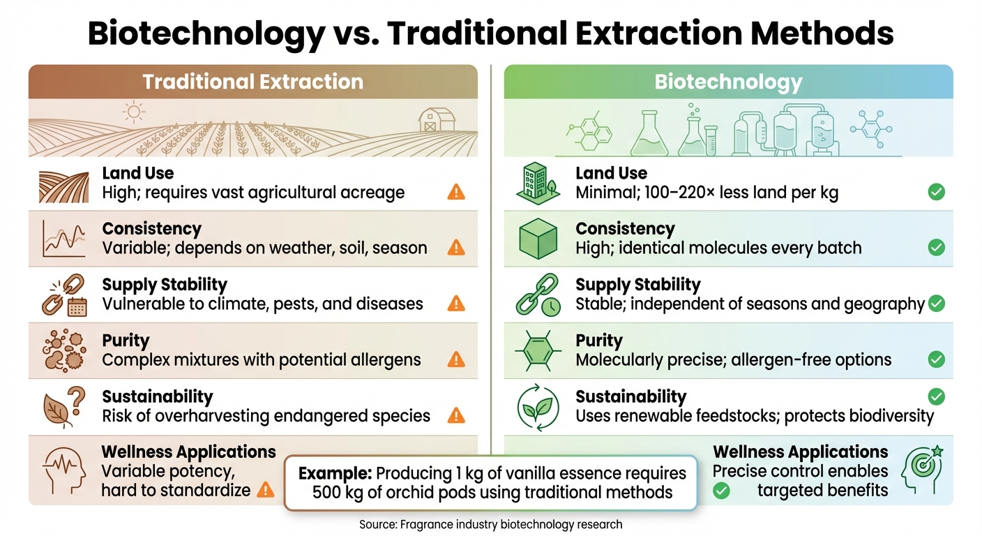 Biotechnology is reshaping how wellness fragrances are crafted, moving away from traditional farming practices toward precise lab-based fermentation. This shift tackles pressing issues like climate-induced supply chain disruptions and the over-harvesting of endangered plants such as sandalwood. At the same time, it offers consistent, allergen-free ingredients that align with modern consumer priorities for safety and environmental responsibility.