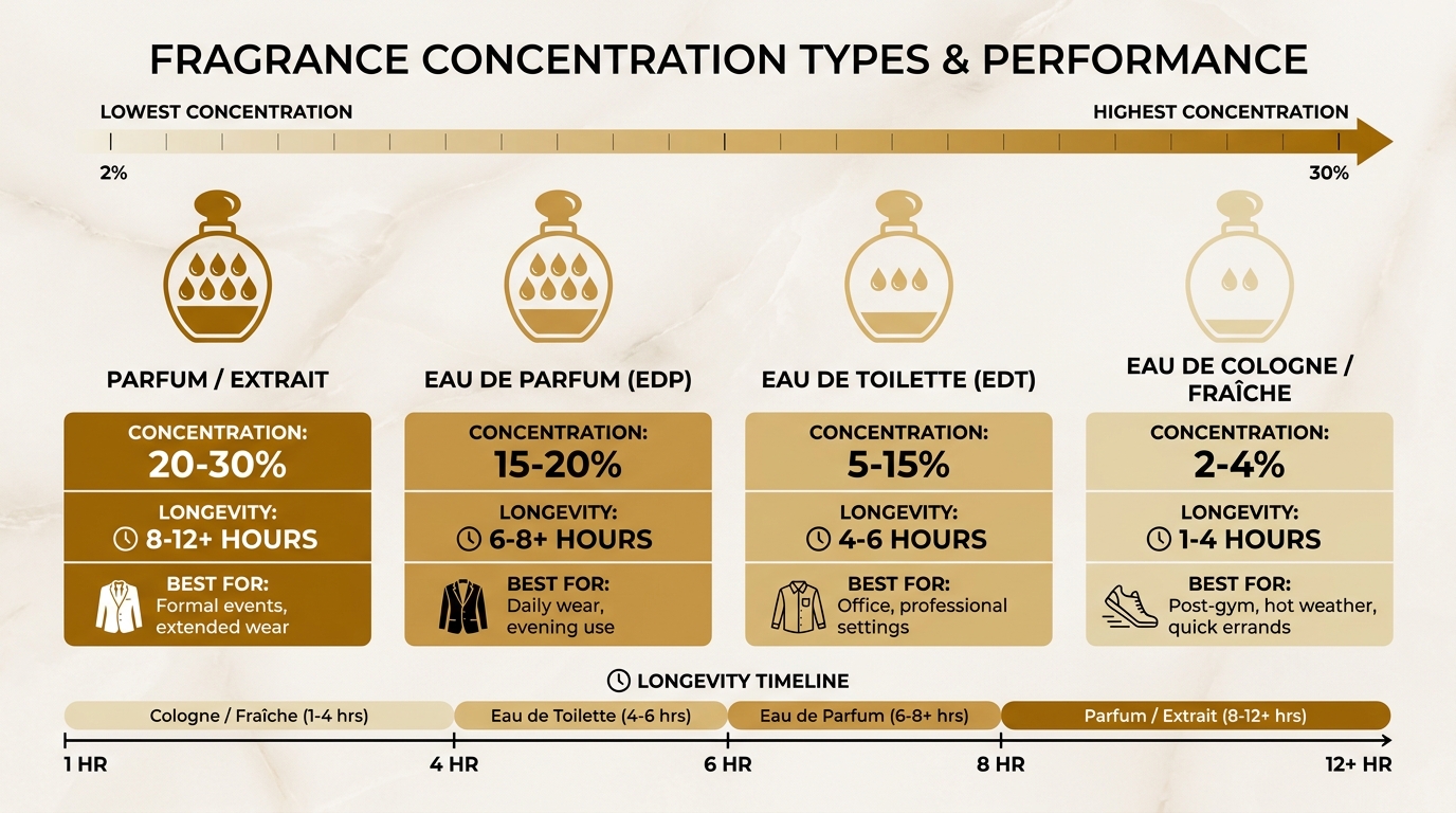 Fragrance TypeConcentrationTypical LongevityBest Use Case