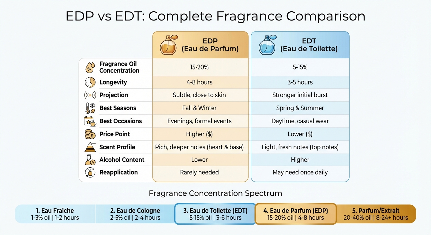 The main difference between Eau de Parfum (EDP) and Eau de Toilette (EDT) comes down to their fragrance oil concentration, which directly impacts how long they last and how strongly they project. EDT typically contains 5% to 15% fragrance oil, offering a lighter, fresher scent that lasts about 3 to 5 hours - perfect for daytime wear or warmer weather. On the other hand, EDP has a higher concentration of 15% to 20%, giving it a richer and more layered profile that lingers for 4 to 8 hours, making it a great choice for evenings or colder seasons. This difference in concentration plays a key role in shaping how a fragrance performs and feels.