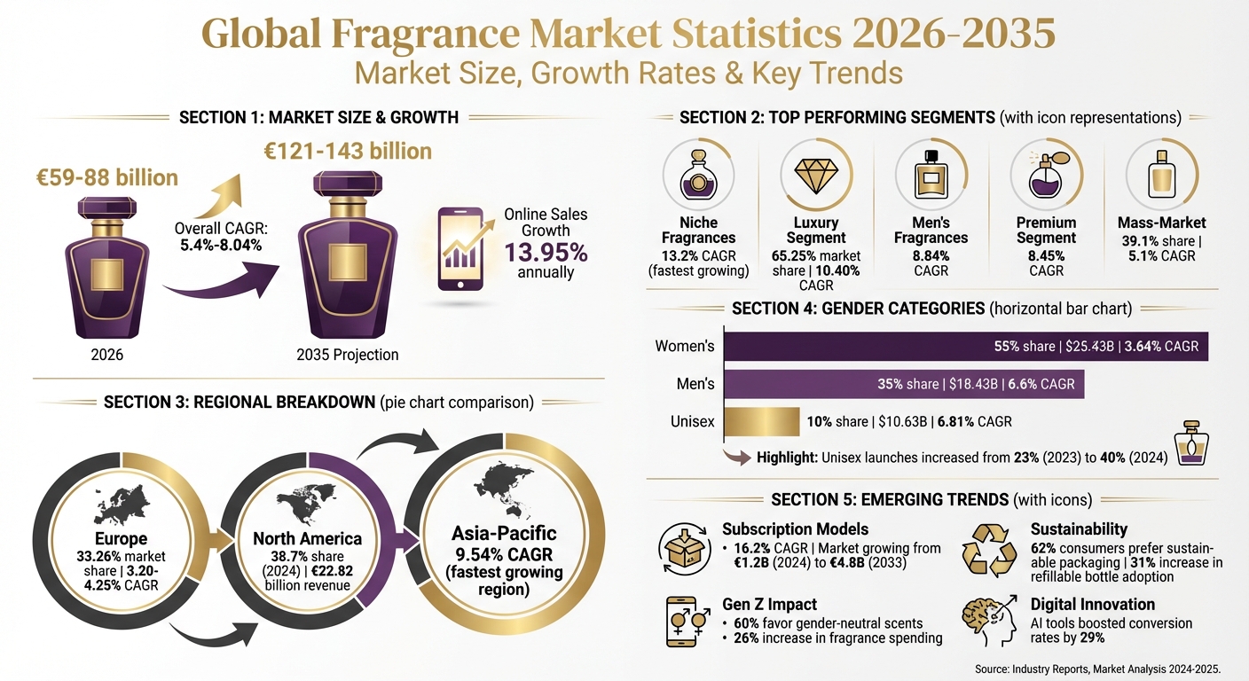 The global fragrance market in 2026 is estimated to be worth €59 billion to €88 billion, driven by growing demand in luxury, niche, and unisex segments. Key highlights include: