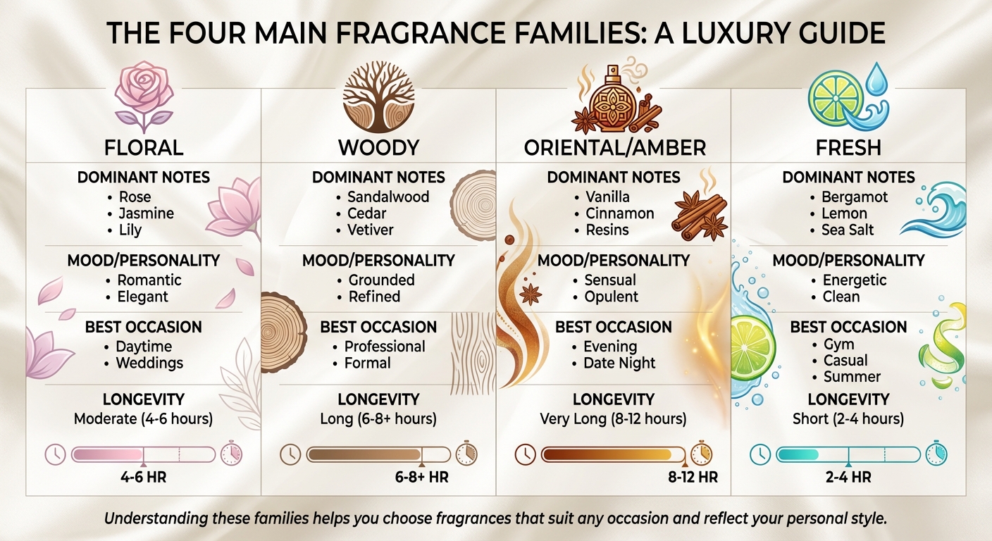 The 4 Main Fragrance Families: Notes, Moods, Occasions & Longevity Guide