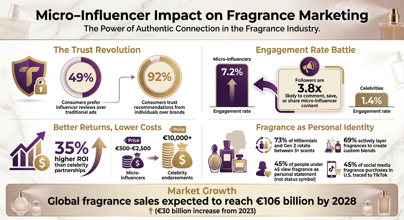 Brands are starting to adapt. Micro-influencer campaigns now deliver a 35% higher ROI than celebrity partnerships, while being far more affordable - costing between €500 and €2,500, compared to over €10,000 for celebrity endorsements. It’s clear that authentic storytelling and relatable voices are reshaping the fragrance industry.