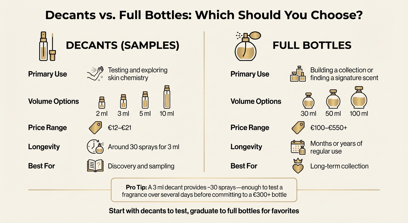 Your choice between decants and full bottles largely depends on your goals. Decants (ranging from 2–10 ml and priced between €12–€21) are perfect for sampling, while full bottles (€100–€550+) are better suited for long-term use and collection. Platforms offering both options provide flexibility as your fragrance preferences evolve.