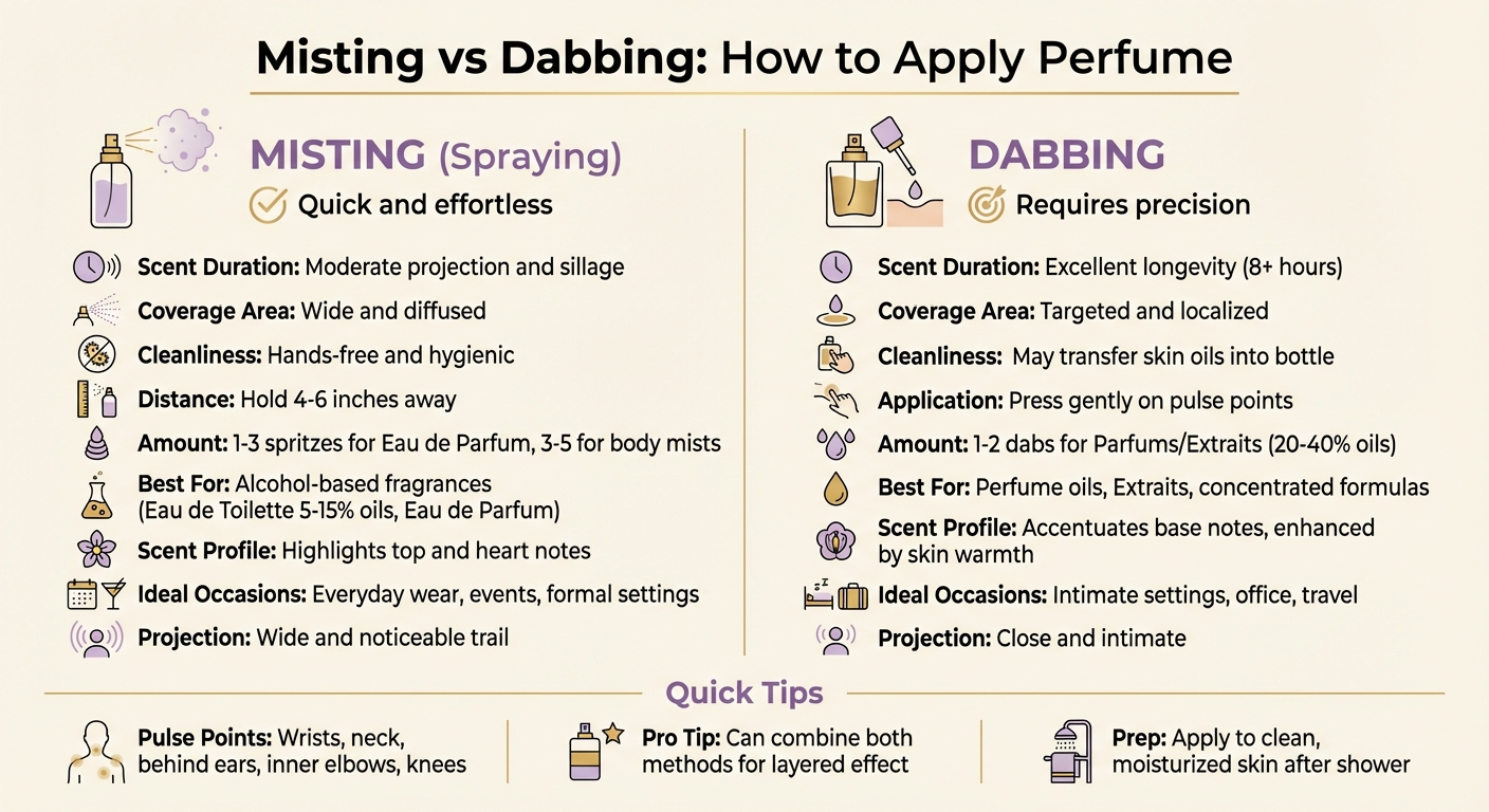 Lehčí vůně často těží z rozprašování pro rovnoměrnou difuzi, zatímco bohatší a koncentrovanější formule se lépe hodí pro přesnost nanášení. Níže uvedená tabulka vše přehledně shrnuje: