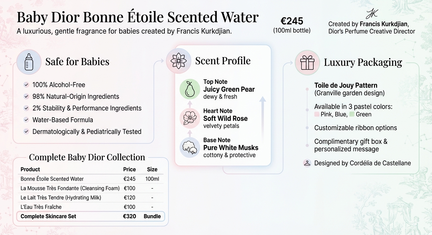 Baby Dior Bonne Étoile nachází rovnováhu mezi elegancí a praktičností, což z ní činí promyšlený dárek pro nové rodiče, kteří upřednostňují jemnou péči o citlivou pokožku svého dítěte. Díky jemnému, přírodnímu složení a delikátní směsi hrušky, divoké růže a bílého pižma tato vonná voda představuje kreativní mistrovství Francise Kurkdjiana a Cordélie de Castellane.