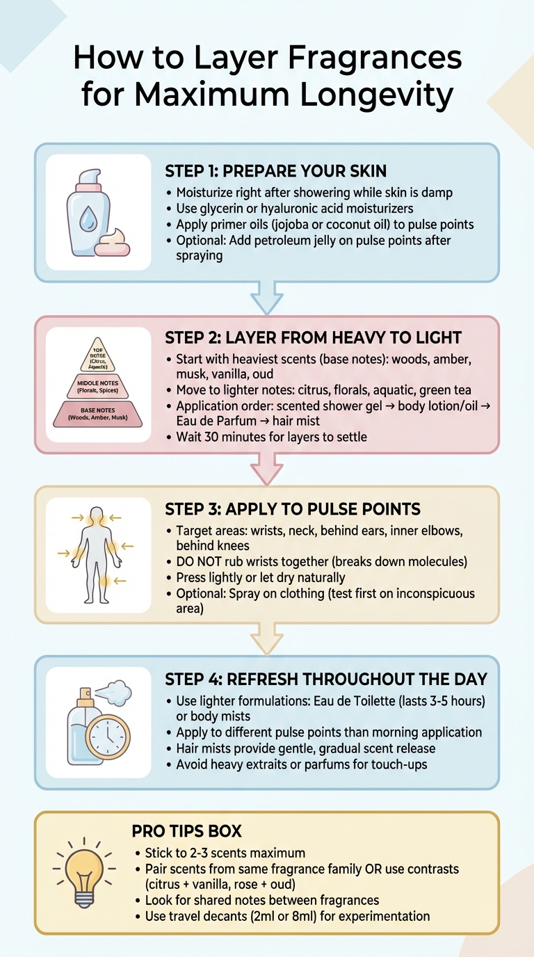 Výhody vrstvení: Začněte hydratovanou pokožkou, použijte oleje nebo voňavá tělová mléka a aplikujte vůně ve specifickém pořadí (nejtěžší základní tóny jako první, lehčí vrchní tóny nakonec).