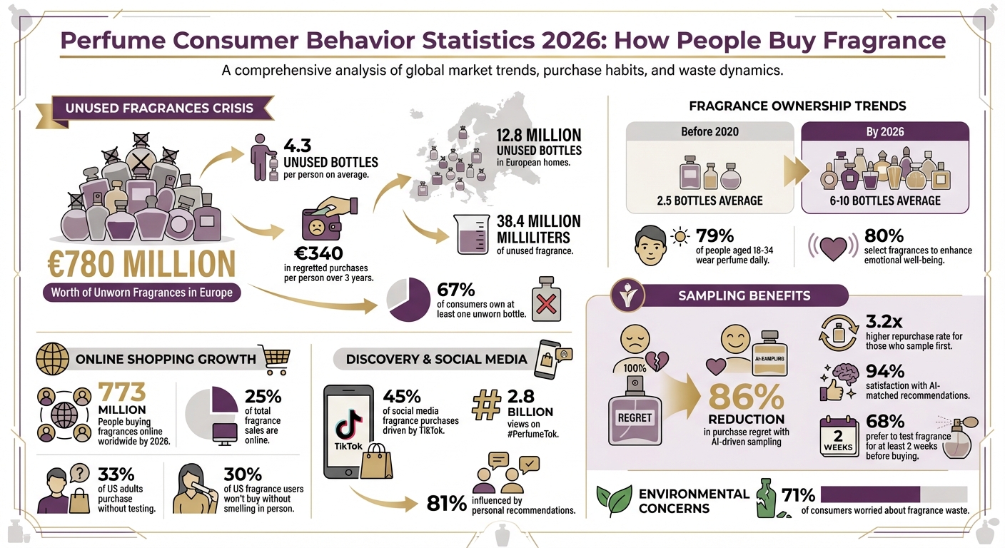 Nákup naslepo často vede ke zklamání. Ve skutečnosti 67 % spotřebitelů uvádí, že vlastní alespoň jednu nevyužitou lahvičku, přičemž průměrná osoba má 4,3 nepoužité lahvičky – ztráta přibližně 340 € v hodnotě. V celé Evropě to znamená 38,4 milionu mililitrů nevyužitých vůní. Avšak vzestup AI-poháněného vzorkování prokázal, že míra lítosti klesá o 86 %. Tento posun povzbudil spotřebitele k větší experimentaci a vedl k růstu rozmanitých parfémových kolekcí.
