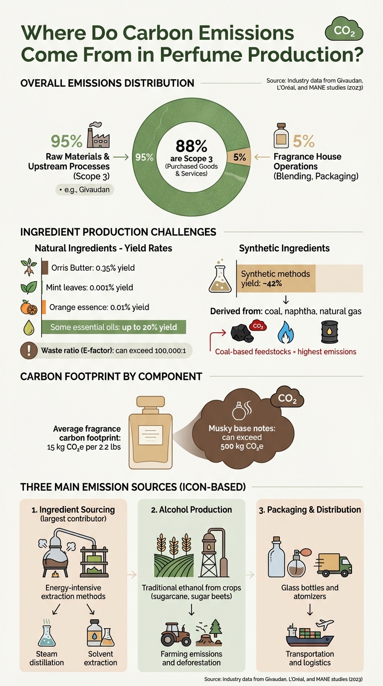 Proces získávání ingrediencí je jedním z největších přispěvatelů k uhlíkové stopě parfému. U velkých parfumérských společností jako Givaudan je přibližně 88 % emisí zařazeno do Scope 3, což zahrnuje především emise z nakupovaného zboží a služeb.