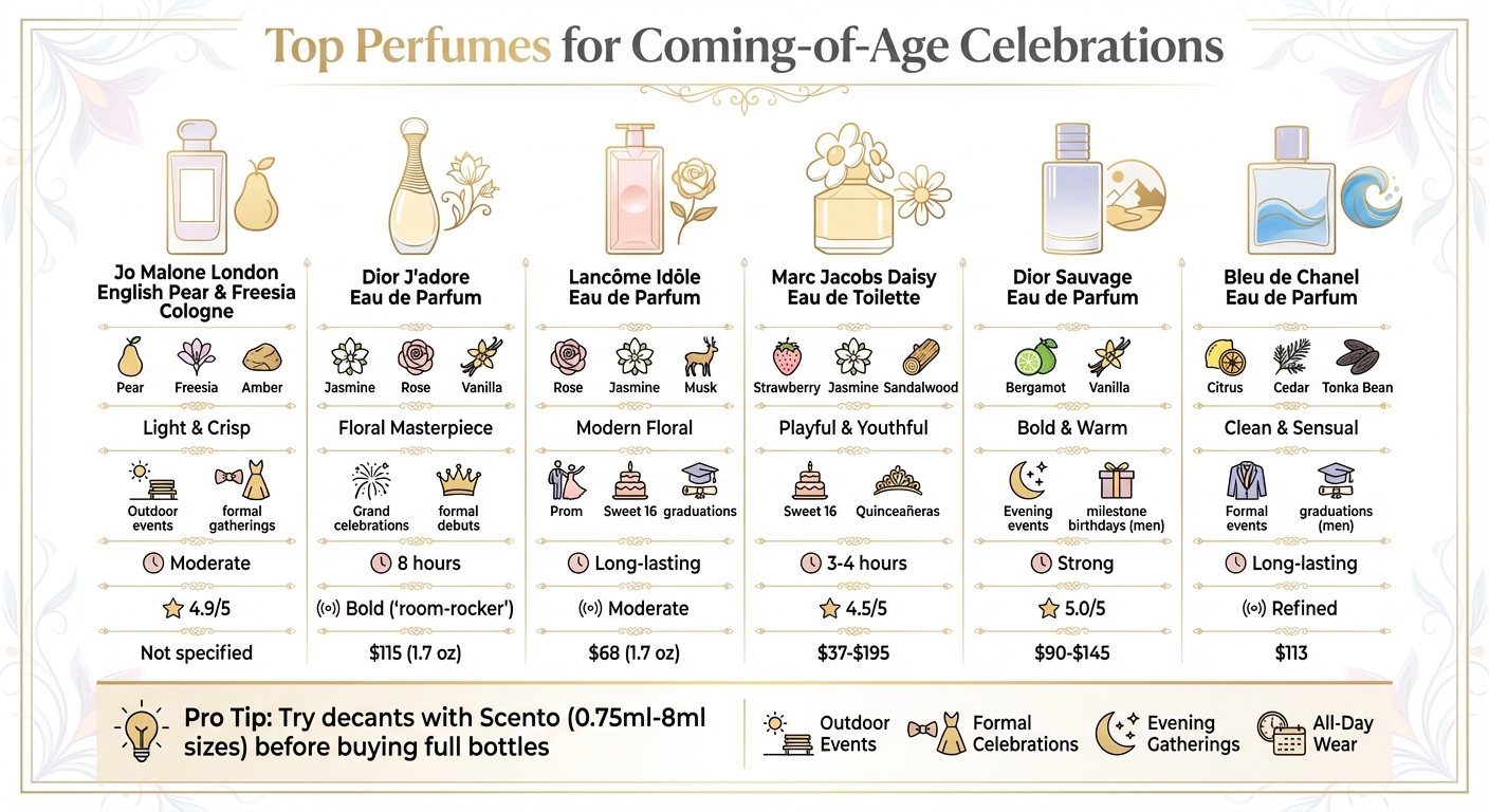 Výběr dokonalého parfému pro významnou oslavu může dodat události zvláštní rozměr. Pro mladistvé akce, jako jsou promoce nebo debutantské plesy, se skvěle hodí lehké květinové nebo svěží vůně. Zachycují podstatu nových začátků a energie. Skvělým příkladem je Dior J’adore Eau Lumière, jemná květinová vůně, která je elegantní a nadčasová.