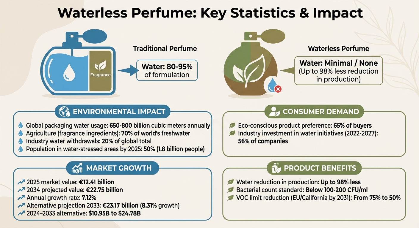 Výroba parfémů bez vody proměňuje parfumérský průmysl tím, že snižuje spotřebu vody, množství odpadu i energetickou náročnost. Tradiční postupy jsou silně závislé na vodě a rozpouštědlech na bázi alkoholu, což přispívá k vyčerpávání zdrojů a environmentálním problémům. Nové přístupy, jako je extrakce pomocí vzduchu a metody se superkritickým CO2, zachovávají kvalitu vůně a zároveň omezují používání vody i chemikálií.