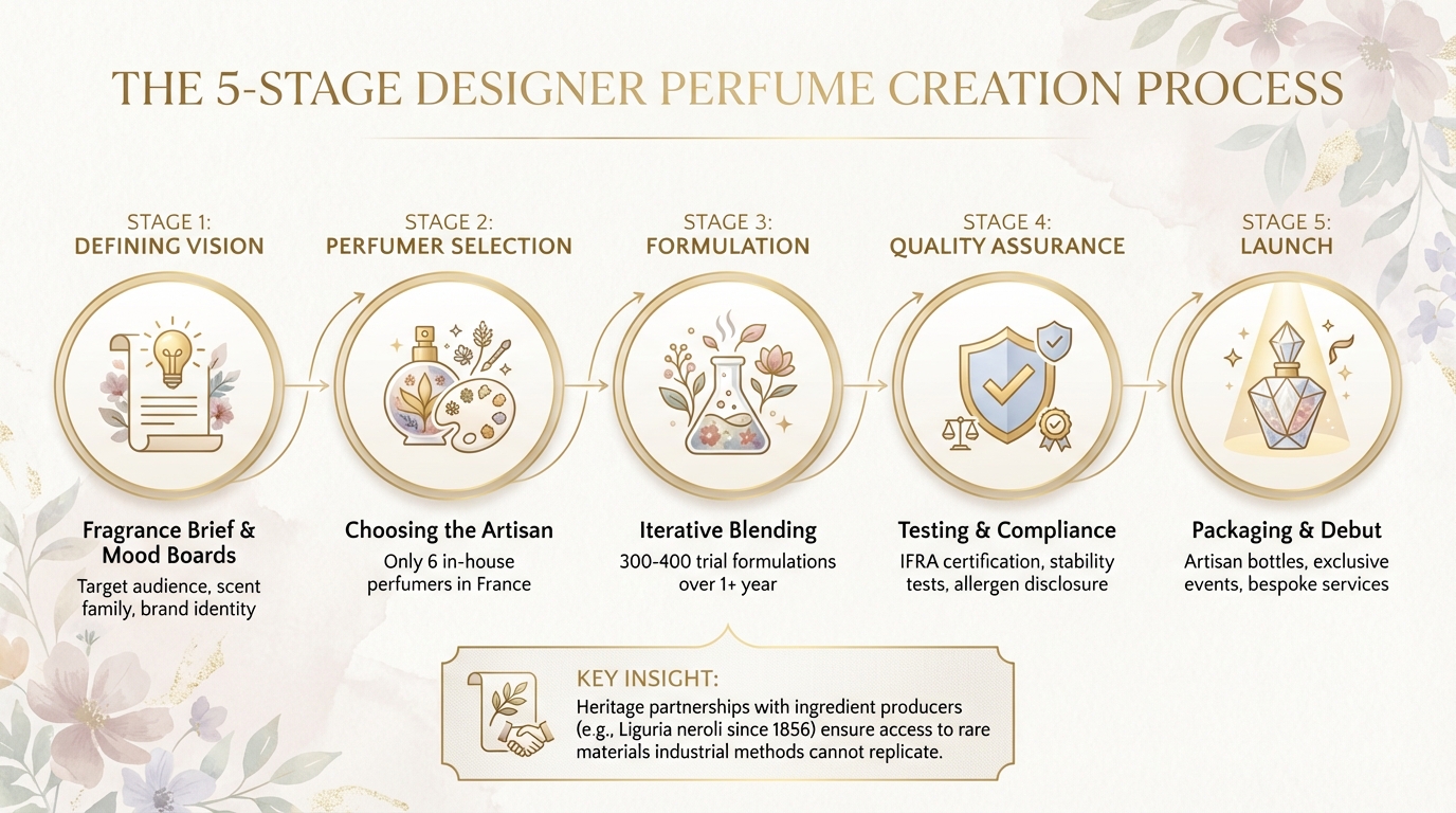 Der Prozess beginnt oft mit einer ersten „Skizze“ – einer groben Mischung, um zu testen, ob Marke und Parfümeur die gleiche kreative Sprache sprechen. Frédéric Malle, Gründer von Editions de Parfums Frédéric Malle, führte Ende der 1990er Jahre einen bahnbrechenden Ansatz ein. Statt Parfümeure zu dirigieren, gab er ihnen völlige kreative Freiheit und verglich seine Rolle mit der eines „Verlegers“. Wie Malle sagte: "Meine Idee war, Parfums für ihren Duft zu machen und nicht für das Image". Damit kehrte er den traditionellen Prozess um, bei dem üblicherweise Marketing und Testimonials die Entwicklung steuern. Stattdessen stand die Kunstfertigkeit des Parfümeurs im Mittelpunkt, dessen Name stolz auf dem Flakon prangt.