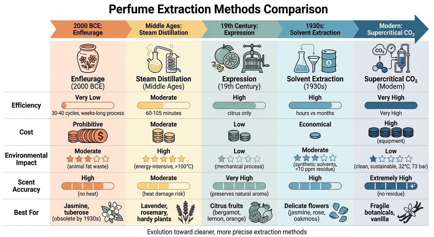 Die Parfümextraktion hat sich über Jahrtausende hinweg gewandelt und vereint antike Methoden mit moderner Wissenschaft. Von den Fetten des Alten Ägypten bis zur heutigen CO₂ — Extraktion beeinflusst jede Technik die Duftqualität, Effizienz und den Ressourceneinsatz. Hier ein kurzer Überblick: