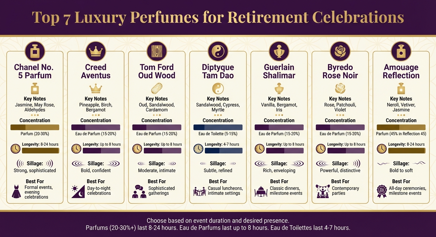 Diese Tabelle hebt die wichtigsten Merkmale von sieben luxuriösen Düften hervor und erleichtert die Wahl des perfekten Parfums für eine Ruhestandsfeier.