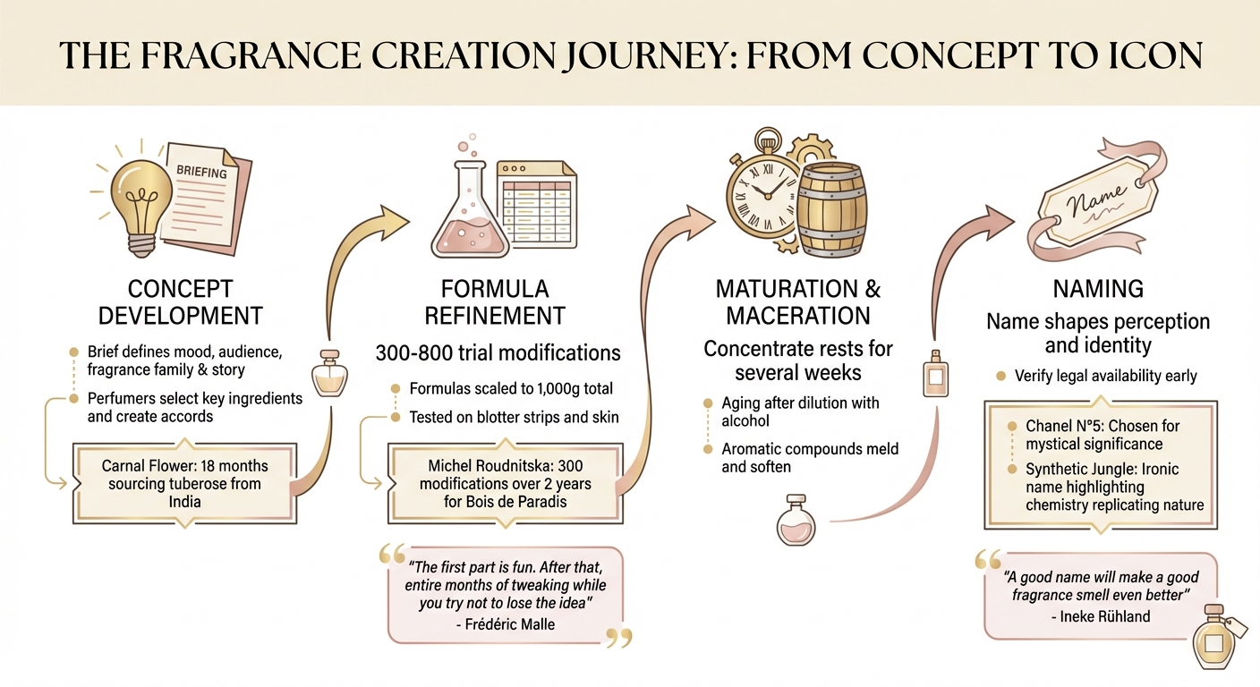 • Kreationsprozess eines Duftes: Parfümeure beginnen mit einem Konzept, verfeinern es durch hunderte Versuche und finalisieren mit besonderer Sorgfalt bei Namensgebung und Reifung.