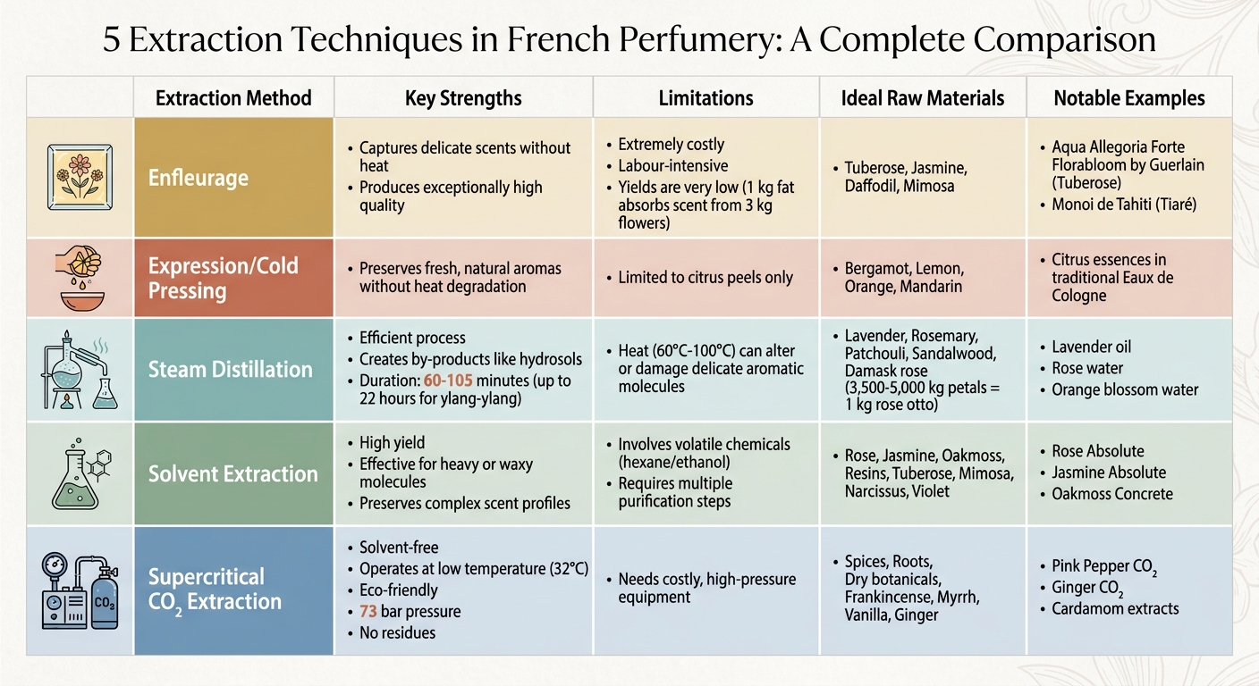 La perfumería francesa se apoya en métodos avanzados para extraer esencias naturales de materias botánicas, dando forma a las fragancias que tanto apreciamos. Desde técnicas históricas como el enfleurage hasta la moderna extracción con CO₂ supercrítico, cada método ofrece ventajas únicas para preservar los perfiles olfativos. Aquí tiene una visión rápida: