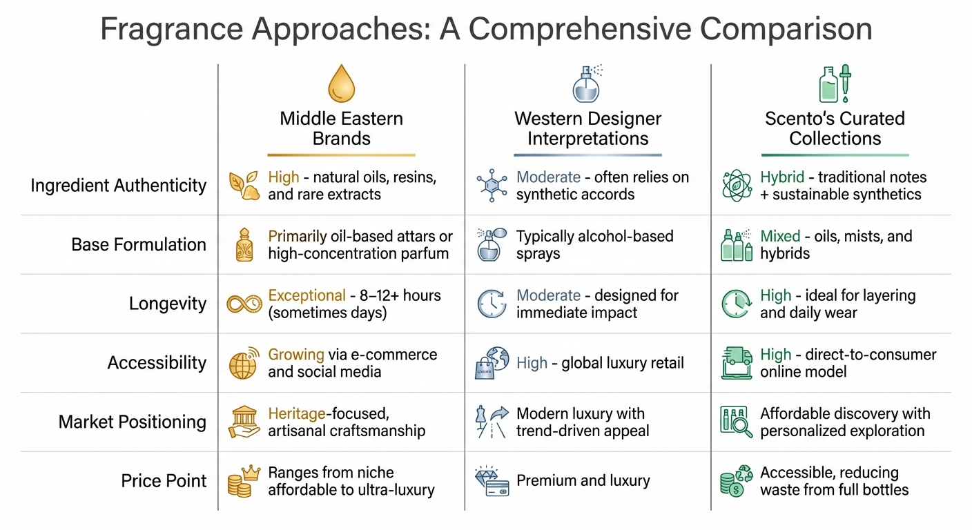 | Característica | Marcas de Oriente Medio | Interpretaciones de diseñador occidental | Colecciones curadas de Scento |