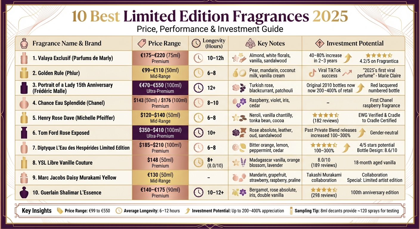 Les parfums en édition limitée de 2025 offrent ce que les fragrances grand public ne peuvent égaler : un sentiment d’exclusivité, des ingrédients rares et la possibilité de porter une histoire qui n’appartient qu’à vous. Prenez Valaya Exclusif avec sa tenue impressionnante de 10–12 heures, ou Portrait of a Lady 15e Anniversaire, à la fois parfum et investissement – les flacons de 2010 valent aujourd’hui 200 à 400 % de leur prix d’origine. Ces sorties illustrent le sommet de la créativité et du savoir-faire en parfumerie.