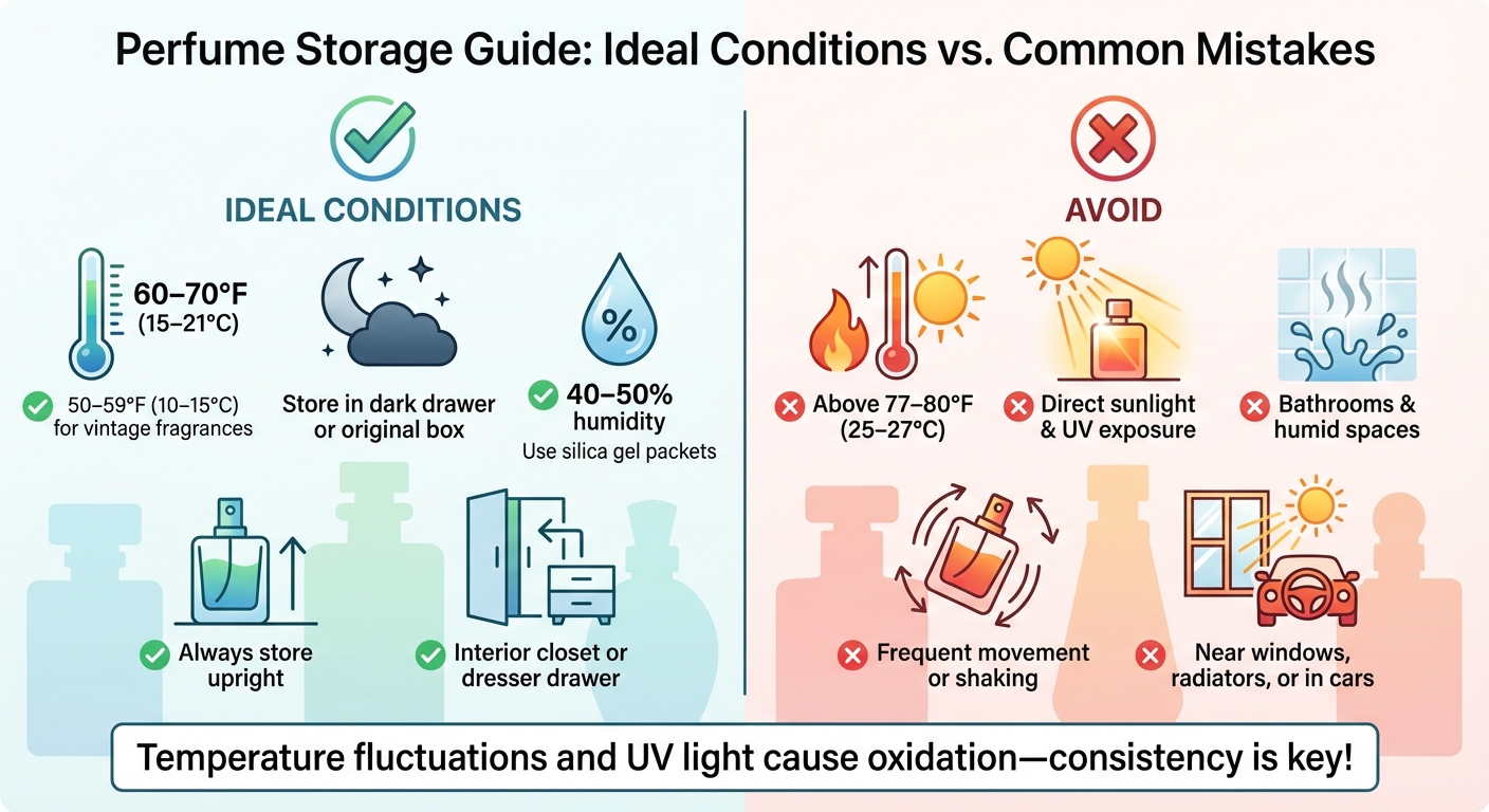 Température : Conservez entre 15 et 21°C ; privilégiez une température plus fraîche (10–15°C) pour les parfums rares ou vintages.