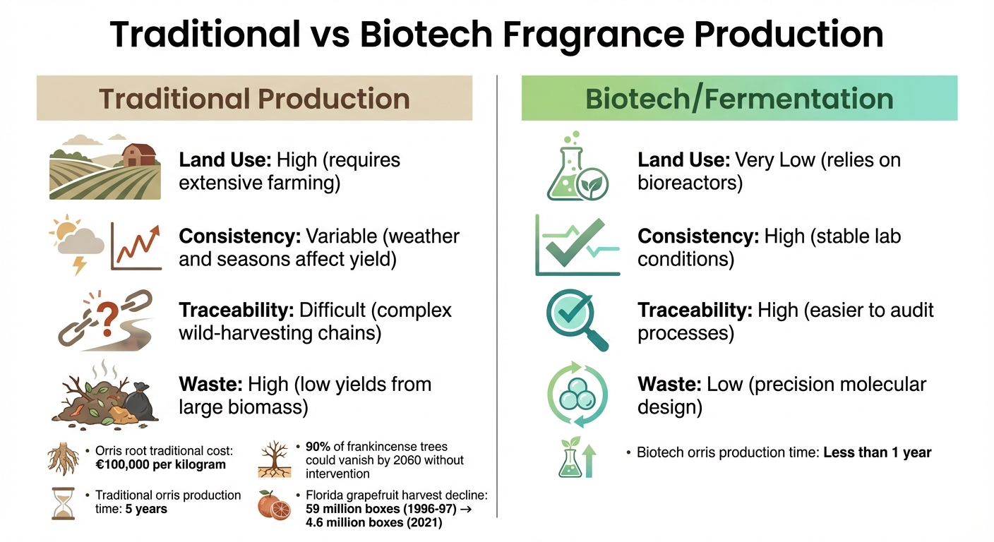 Voici une comparaison entre la production traditionnelle de parfums et les méthodes biotechnologiques :