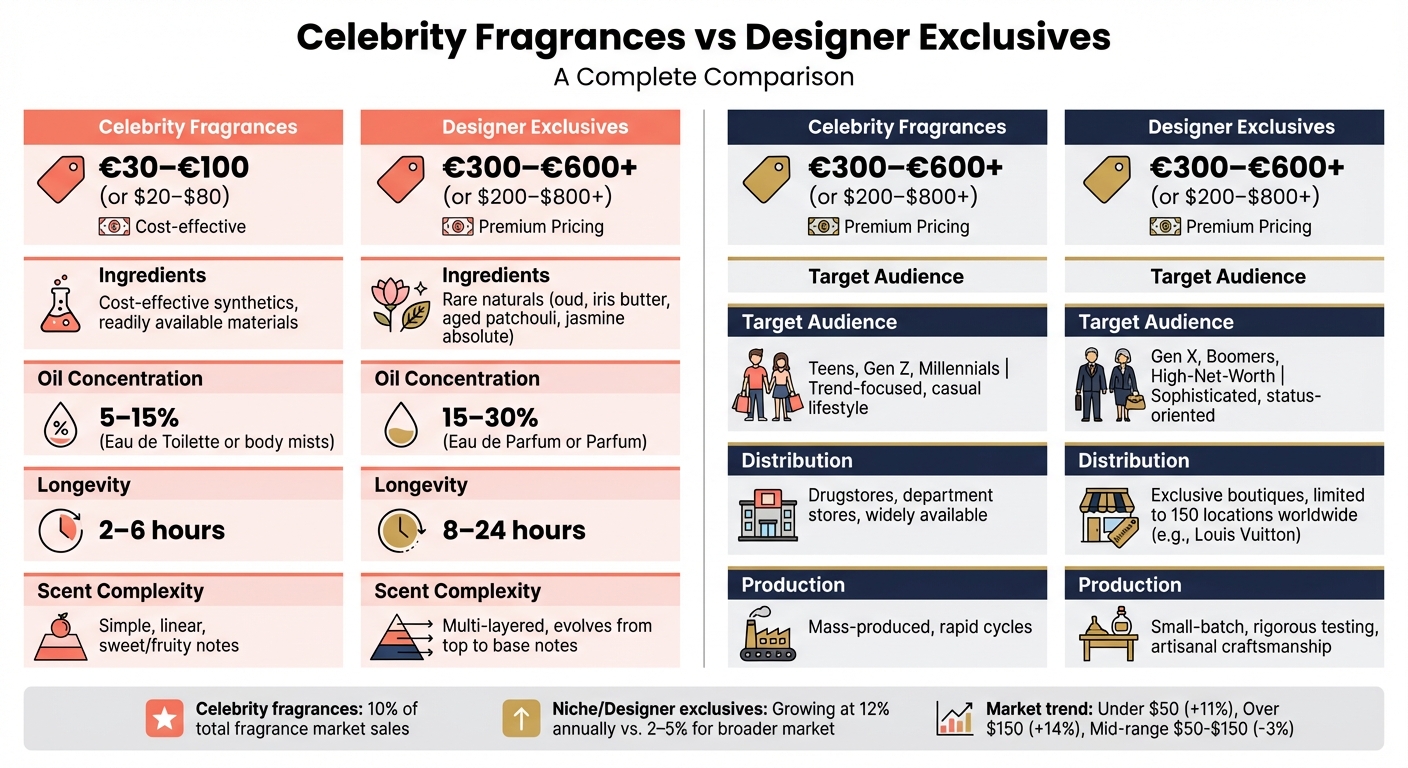 Prix : Parfums de célébrités (30–100 €) vs. exclusivités de créateurs (300–600 €+).