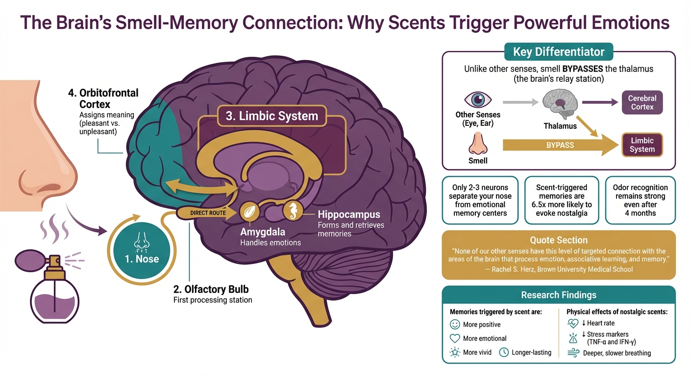 Contrairement aux autres sens, l’odorat emprunte un chemin direct vers les centres émotionnels et mnésiques du cerveau, contournant le thalamus, qui agit habituellement comme station relais cérébrale. Les informations visuelles et auditives doivent d’abord passer par le thalamus avant d’atteindre les zones de gestion des émotions et des souvenirs. En revanche, les signaux olfactifs voyagent directement du nez vers le , puis vers le , où résident l’ (gestion des émotions) et l’ (formation et rappel des souvenirs).