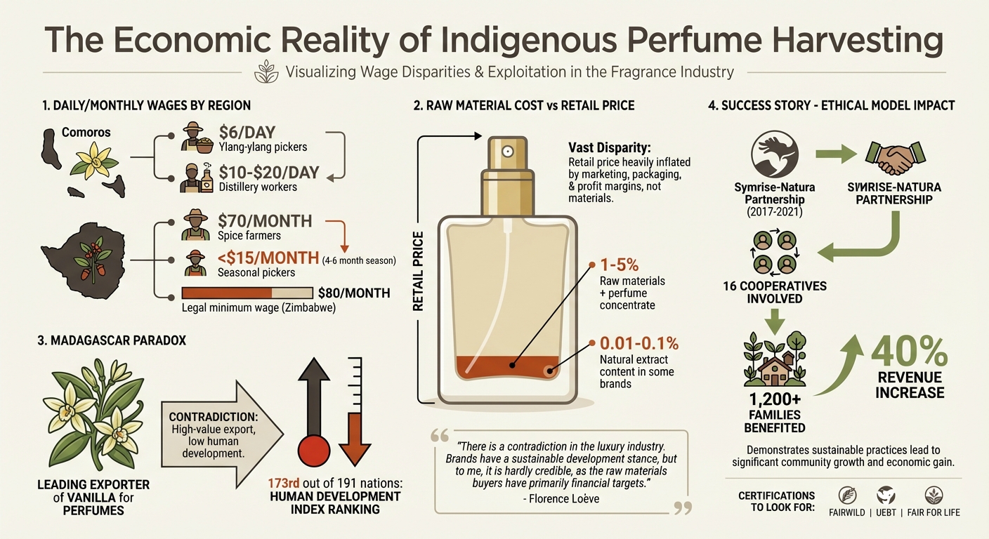 La structure économique de l’industrie du parfum accentue cette exploitation. Les matières premières et le concentré de parfum ne représentent souvent que 1 à 5 % du prix de vente d’un flacon, certaines marques n’incluant que 0,01 à 0,1 % d’un extrait naturel pour pouvoir le mentionner. Malgré le rôle de Madagascar comme premier exportateur de vanille pour la parfumerie, le pays se classe 173e sur 191 à l’Indice de Développement Humain – un contraste saisissant avec la valeur de ses exportations.