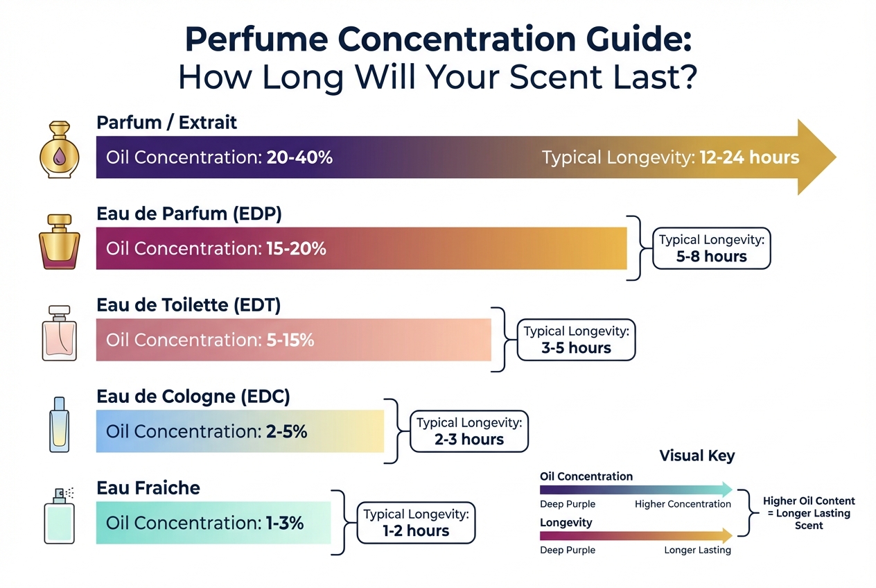 Tableau comparatif des types de concentration de parfum et de leur longévité