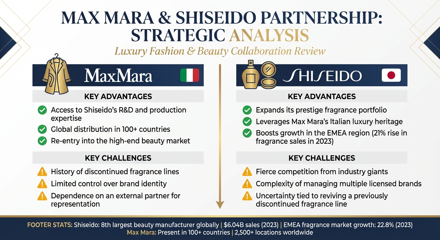 Pour Max Mara, l’un des avantages les plus notables est l’accès à la renommée expertise de recherche et développement de Shiseido. Après des tentatives antérieures peu concluantes pour lancer une ligne de parfums, la maison italienne recherchait un partenaire dont le savoir-faire soit éprouvé pour faire prospérer une griffe dans la parfumerie. Grâce à l’impressionnant réseau de distribution de Shiseido – couvrant plus de 100 pays – Max Mara bénéficie d’une opportunité unique de se réimposer sur le marché de la beauté de luxe. Mais cela a un prix : en s’en remettant à un partenaire externe, Max Mara s’expose à perdre une part de contrôle sur son identité de marque. Si les fragrances s’éloignent trop des racines du luxe italien de la marque, c’est l’essence même de Max Mara qui risque d’être diluée.