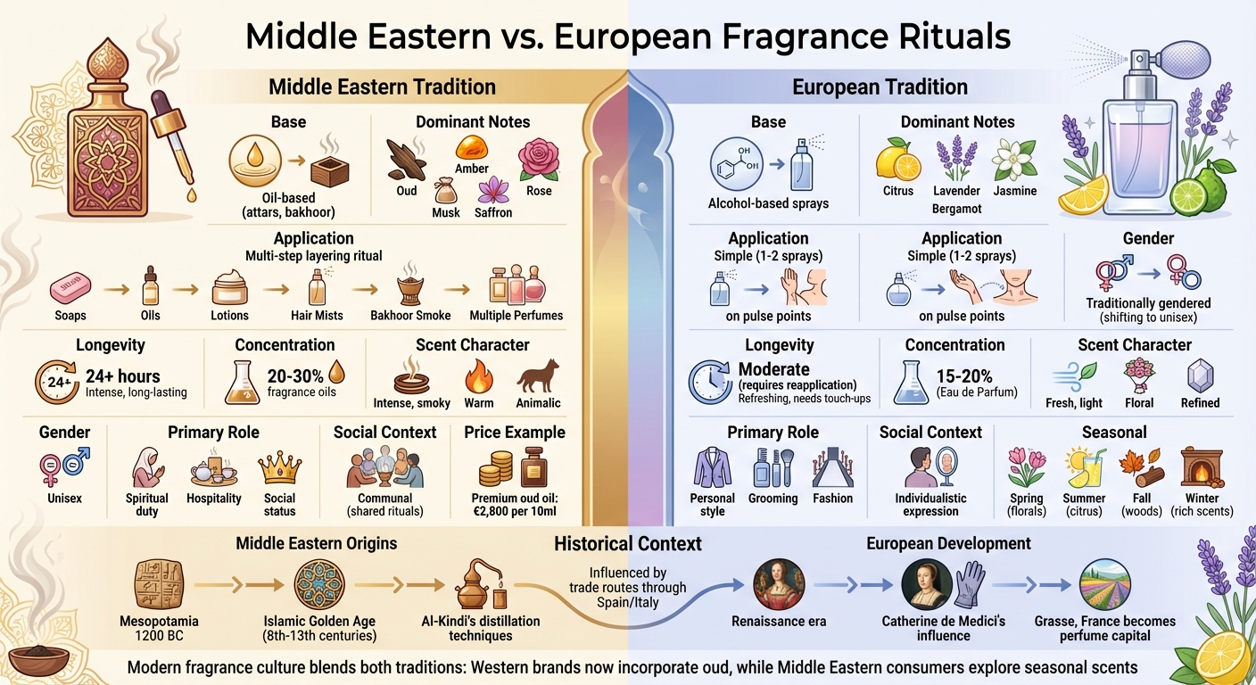 Les traditions parfumées européennes contrastent fortement avec les rituels superposés et huileux typiques du Moyen — Orient. Elles privilégient des sprays raffinés et directs, adaptés à la diversité des climats et des cultures du continent.