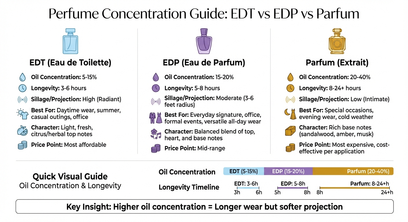 EDT vs EDP vs Parfum : Comparaison de la concentration en huiles, de la longévité et des meilleurs usages