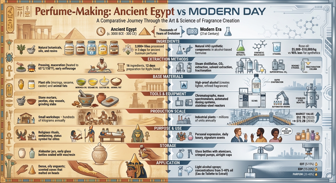 Quelles sont les différences entre les techniques de parfumerie de l’Égypte antique et celles d’aujourd’hui ?