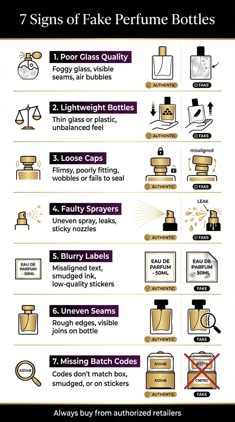 Détecter un flacon de parfum contrefait repose souvent sur l’examen des détails : surveillez la mauvaise qualité du verre, la répartition inégale du poids, les bouchons lâches, les vaporisateurs défectueux, les étiquettes floues ou mal alignées, les coutures irrégulières et les codes de lot manquants.