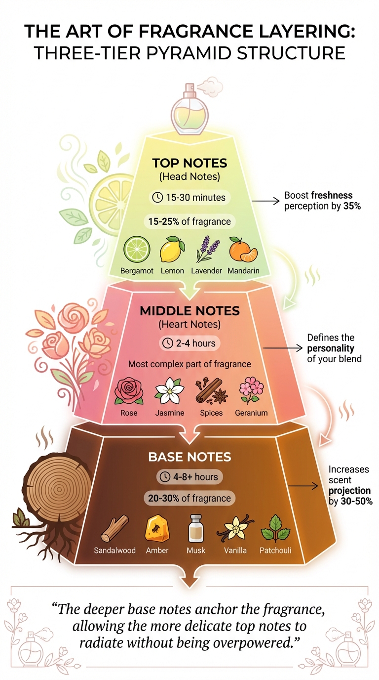 Στο layering, οι νότες κορυφής προσδίδουν φρεσκάδα και ενέργεια στο μείγμα σας. Μια μελέτη του 2021 από το Journal of Sensory Studies έδειξε ότι οι νότες κορυφής με έντονα εσπεριδοειδή αυξάνουν την αίσθηση φρεσκάδας κατά 35%. Αν και αποτελούν μόνο το 15–25% του αρχικού προφίλ, παίζουν καθοριστικό ρόλο στο να θέσουν τον τόνο χωρίς να κυριαρχούν στο συνολικό άρωμα. Αυτή η γνώση θα σας βοηθήσει να επιλέξετε συμπληρωματικές νότες κορυφής που αναδεικνύουν το layering σας.