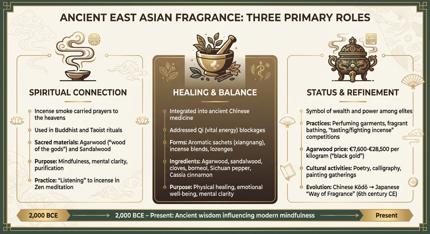 Στην αρχαία Ανατολική Ασία, το άρωμα δεν αφορούσε μόνο ευχάριστες ευωδιές - συμβόλιζε κοινωνική θέση και εκλέπτυνση. Από τη δυναστεία των Han και έπειτα, τα σπάνια και εξωτικά αρωματικά υλικά έγιναν σαφής ένδειξη δύναμης και προνομίου.