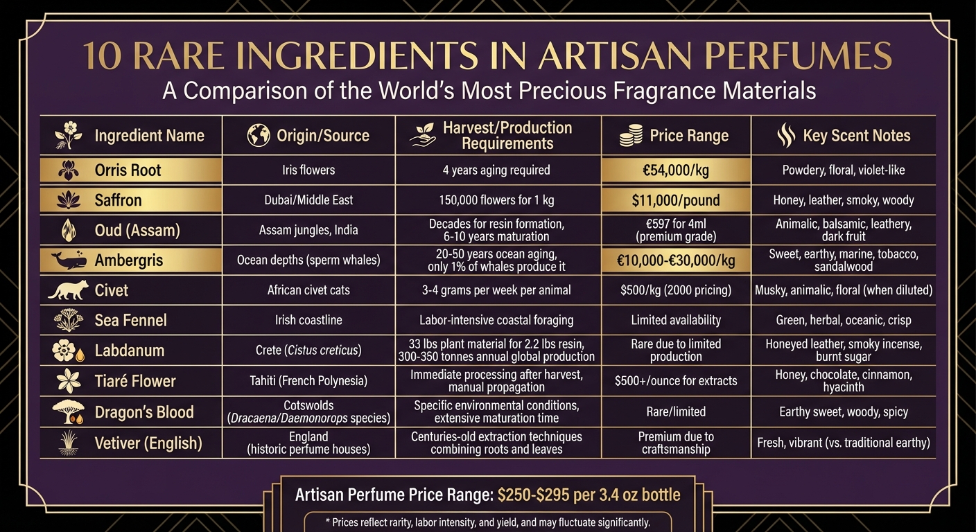 Artisan perfumes stand apart due to their use of rare, natural ingredients sourced through labor-intensive and time-honored methods. These components are not only difficult to obtain but also add unparalleled depth and complexity to fragrances. Here’s a quick overview of the rare ingredients discussed: