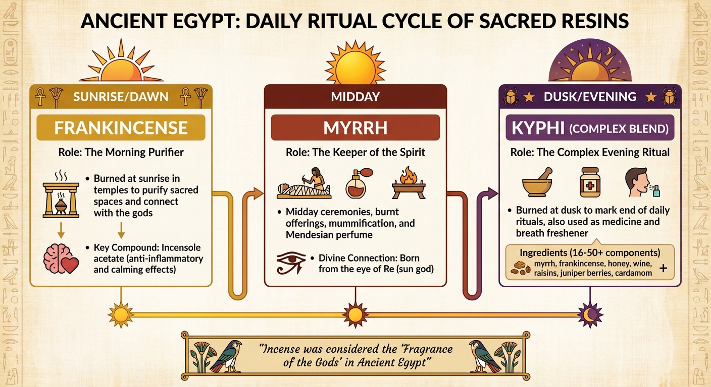 Στον καθημερινό ρυθμό της ζωής των αιγυπτιακών ναών, το λιβάνι κατείχε ξεχωριστή θέση ως η ρητίνη της αυγής. Κατά την ανατολή του ηλίου, οι ιερείς έκαιγαν αυτή τη ρητίνη για να καθαρίσουν τους ιερούς χώρους και να γεμίσουν το ναό με θεϊκή ενέργεια.