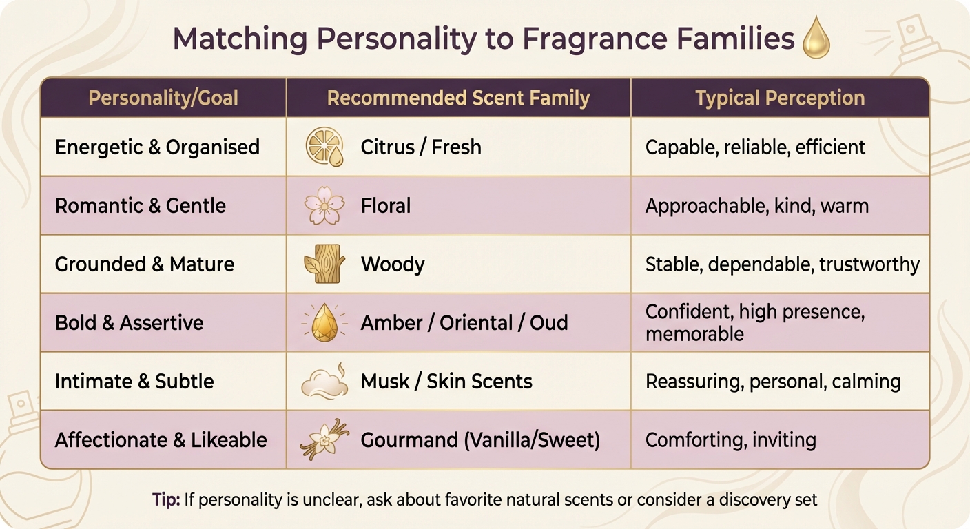 | Προσωπικότητα/Στόχος | Προτεινόμενη αρωματική οικογένεια | Τυπική αντίληψη |