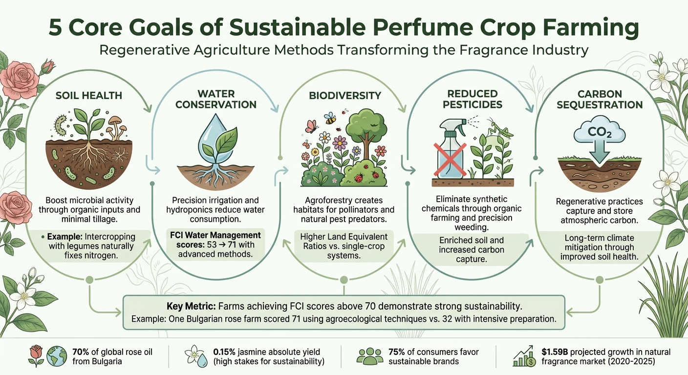 Modern sustainable farming practices are stepping up to address environmental challenges while producing the essential ingredients for fragrances. These methods focus on five key goals: improving soil health, conserving water, enhancing biodiversity, cutting down on pesticide use, and reducing carbon emissions. Here’s a closer look at how these practices are making a difference.