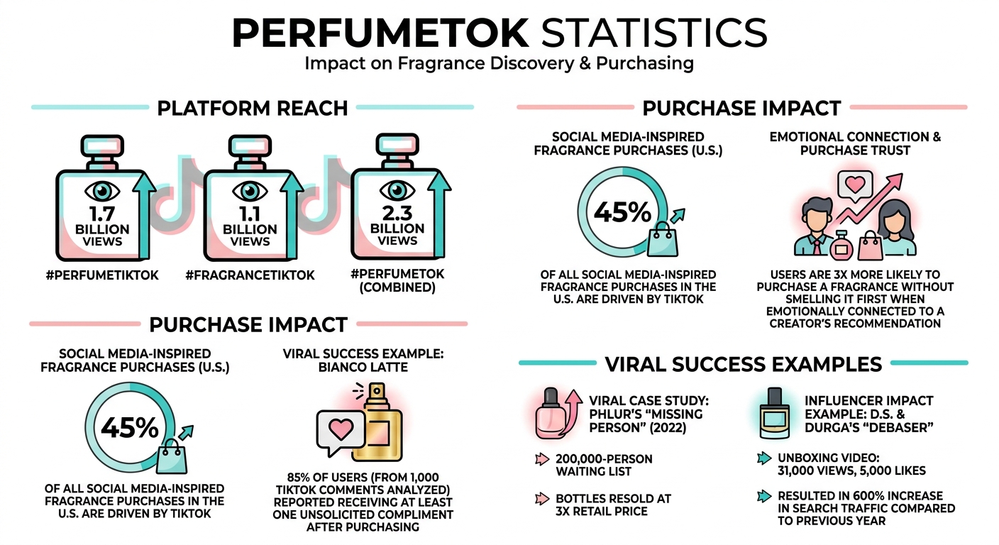 A PerfumeTok, a TikTok illatokra fókuszáló közössége, alapjaiban formálta át, hogyan fedezik fel és vásárolják meg az emberek a parfümöket. Az olyan hashtagekkel, mint a #PerfumeTikTok (1,7 milliárd megtekintés) és a #FragranceTikTok (1,1 milliárd megtekintés), a TikTok ma már az összes közösségimédia-inspirálta illatvásárlás 45%-át generálja az Egyesült Államokban. Az alkotók történetmeséléssel, közérthető nyelvezettel és érzelmi hatásokkal írják le az illatokat, így nincs feltétlenül szükség fizikai mintákra. A virális trendek gyakran kultikus kedvencekké emelnek niche illatokat, ahogyan az Giardini Di Toscana Bianco Latte esetében is történt, amelyet tartós édességéért ünnepelnek.