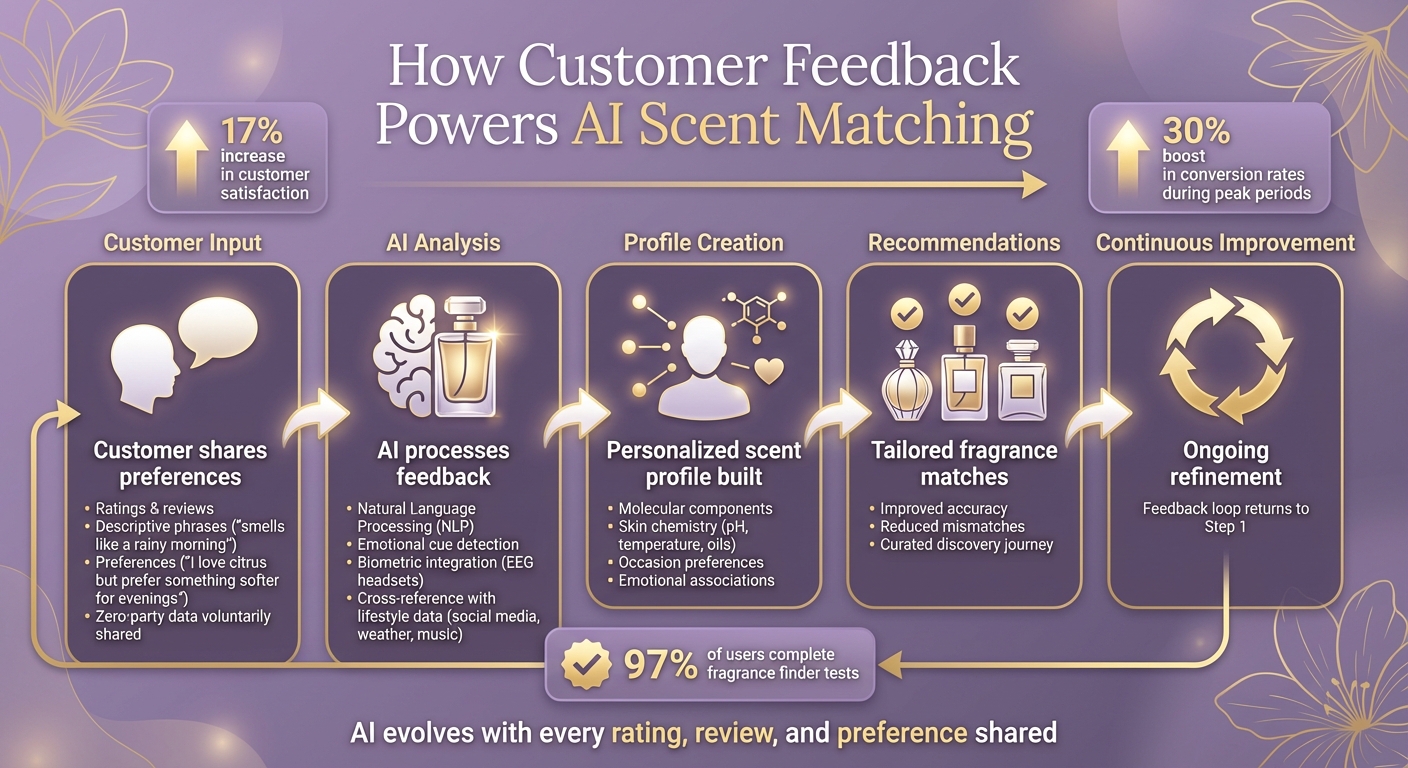 Quando il feedback dei clienti viene integrato negli algoritmi di IA, i risultati sono notevoli. L’IA guidata dal feedback può aumentare i tassi di conversione fino al 30% durante i periodi di picco e migliorare la soddisfazione dei clienti del 17%. Questo approccio non si limita a ridurre gli abbinamenti sbagliati: rende la scoperta delle fragranze più fluida e piacevole.