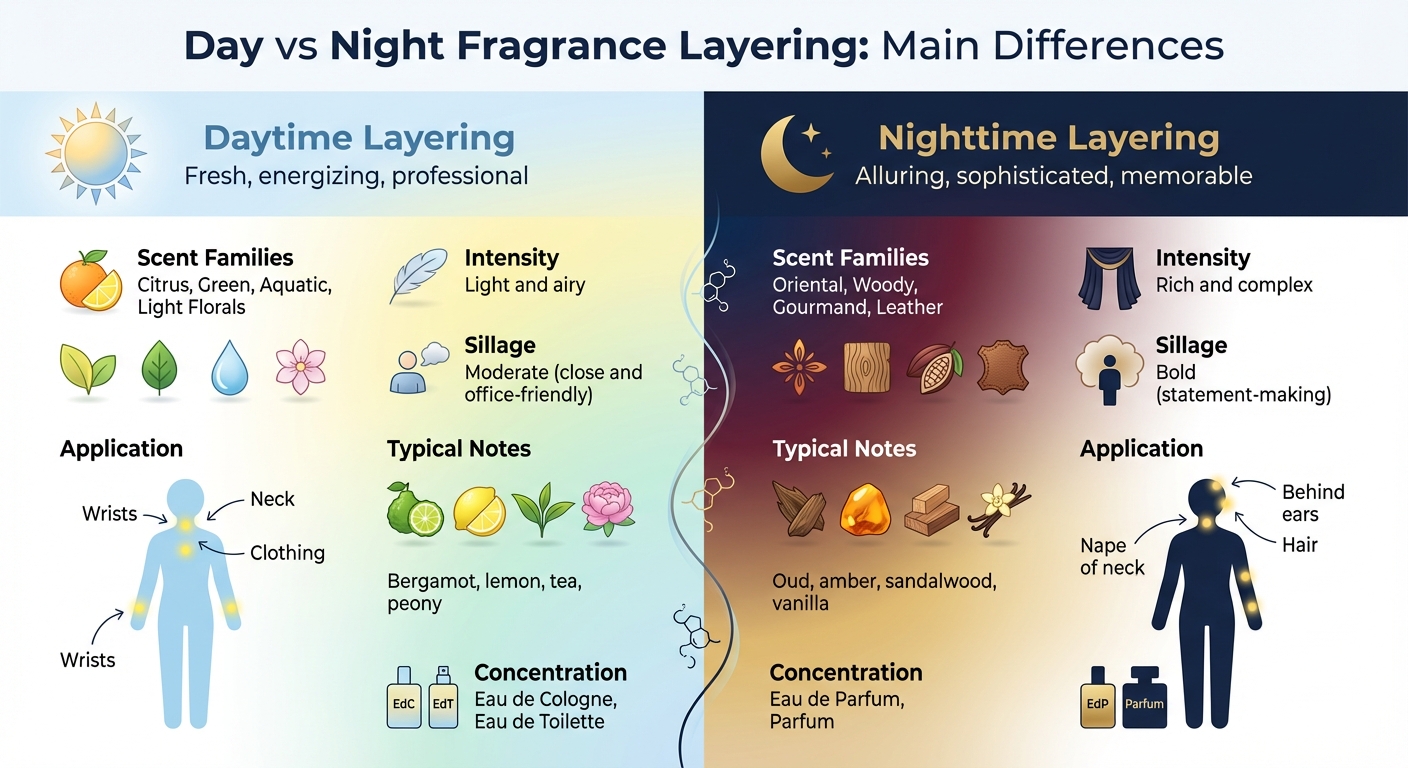 Ghid comparativ pentru layeringul parfumurilor de zi vs de seară