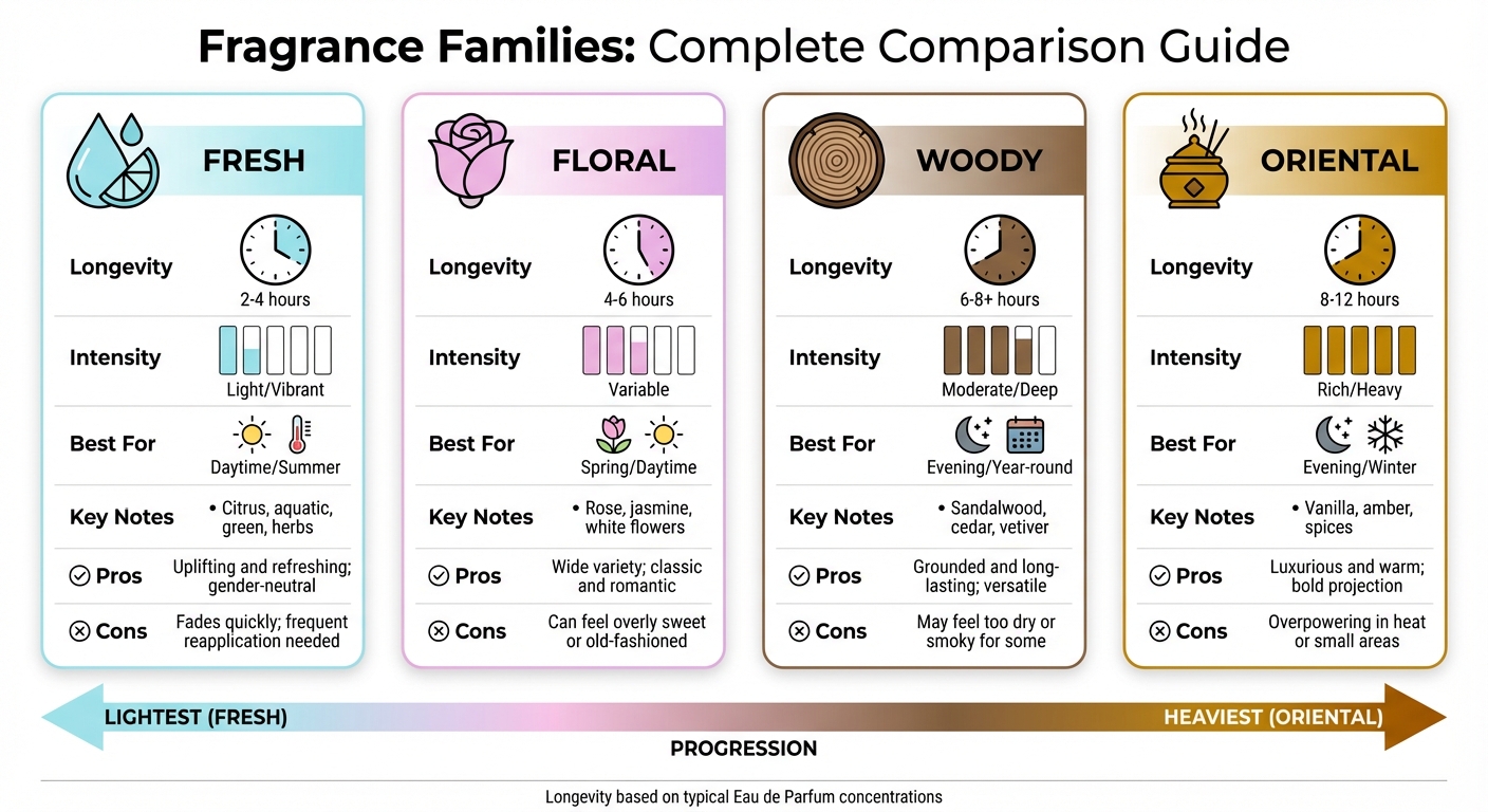 După ce am explorat în detaliu familiile florală, orientală, lemnoasă și proaspătă, iată o comparație concisă a punctelor forte și a limitărilor fiecăreia.