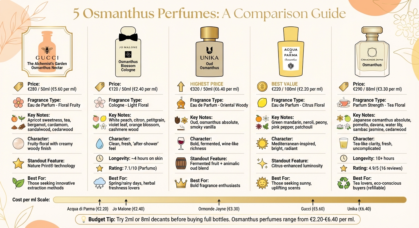 Comparație a 5 parfumuri cu Osmanthus: Preț, Note și Caracteristici